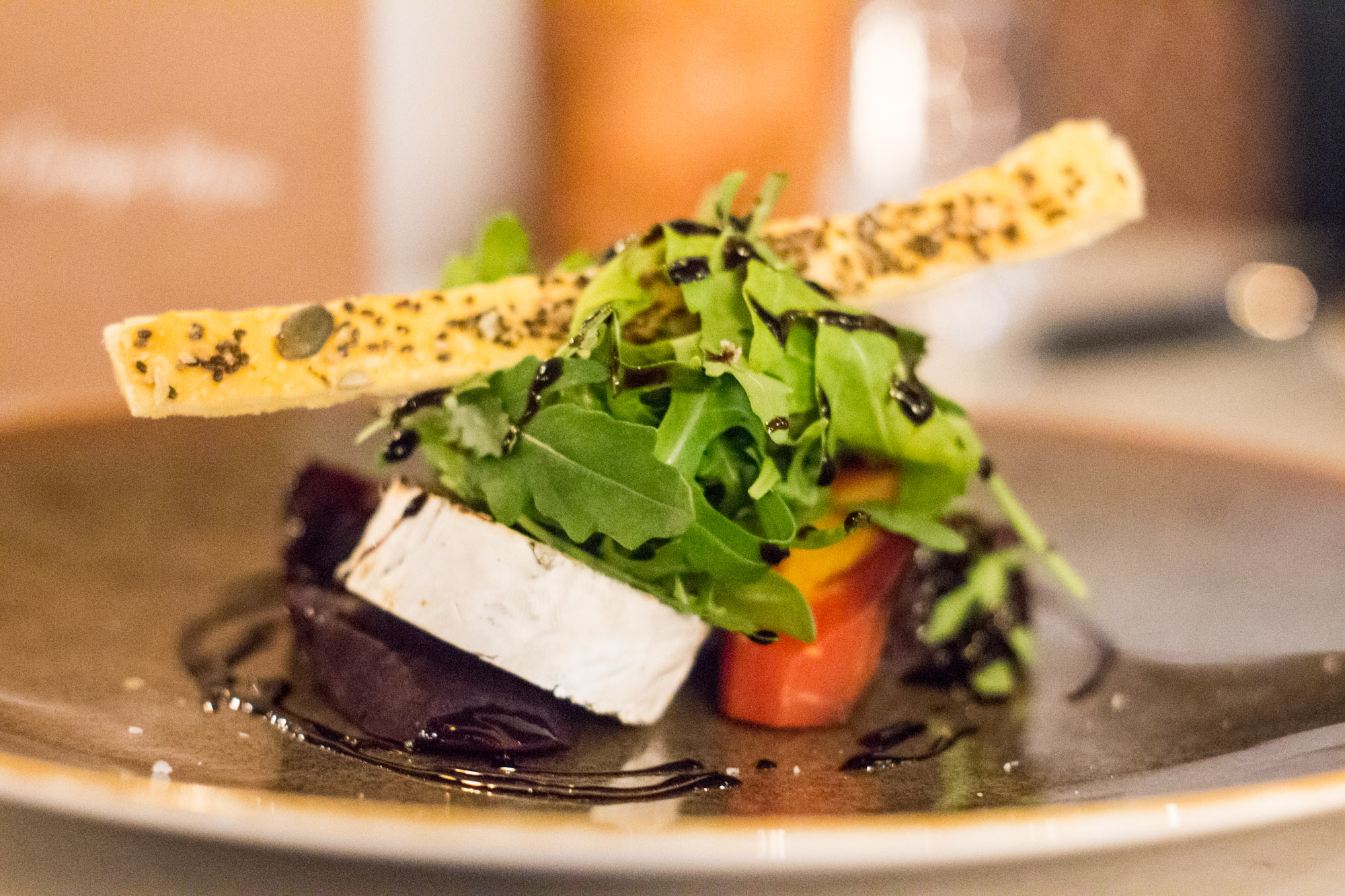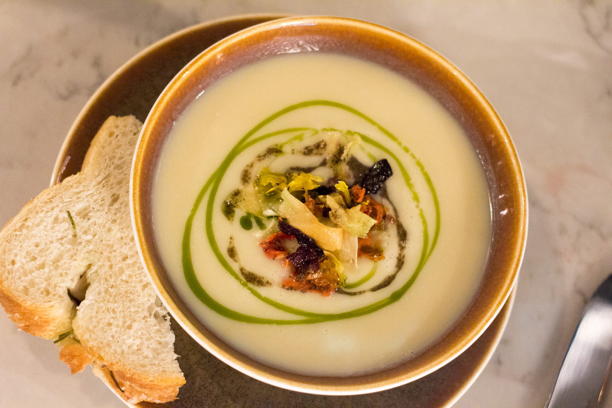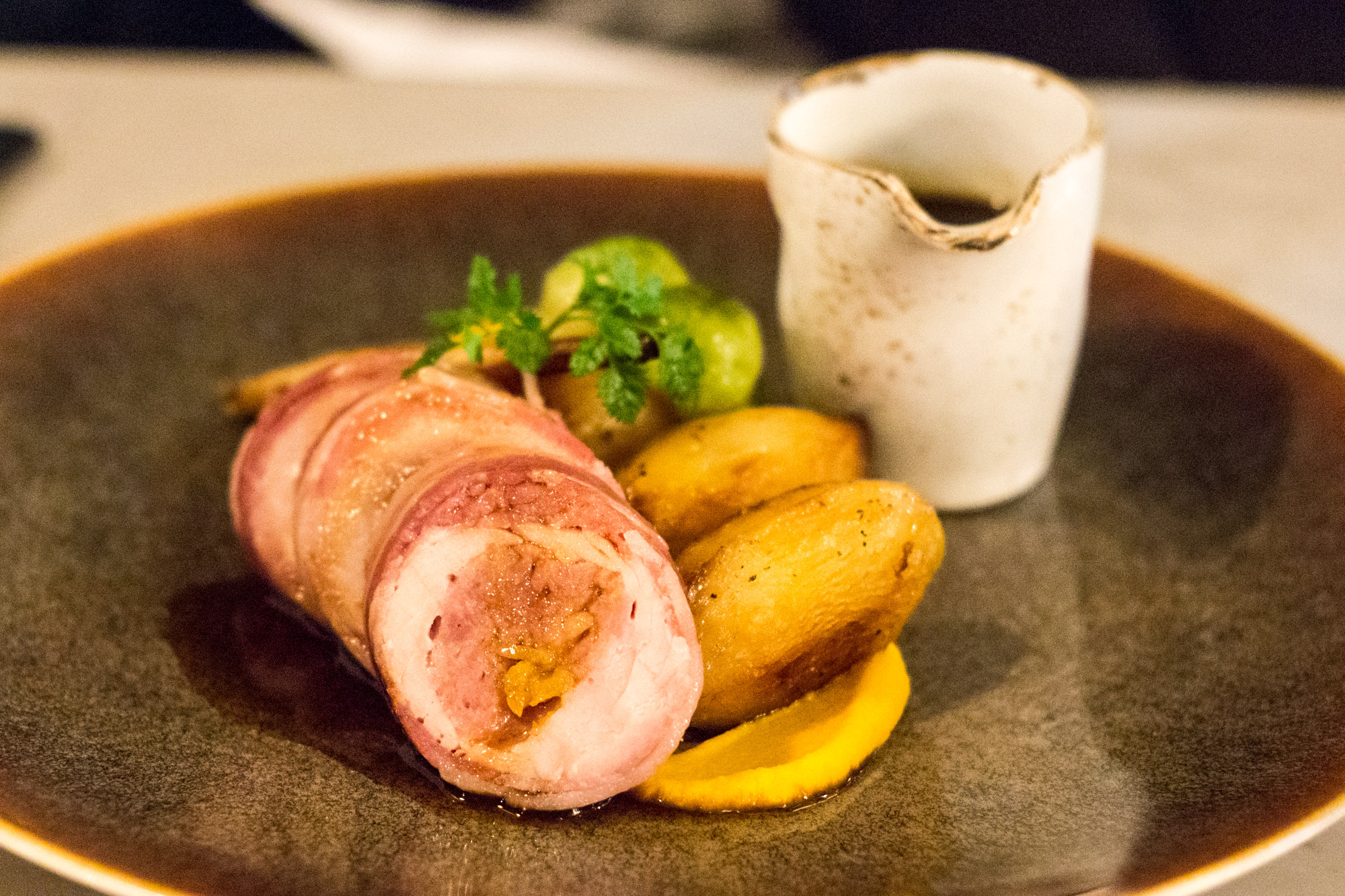 For starters, we go for the roast beetroot and heritage carrot salad, complete with thick slabs of glazed Lancashire goat’s cheese and a long crunchy slice of seeded tuille perched on top. The beetroot is non-too-earthy, thankfully, and the similarly deep purple carrot pairs well with the creamy goat’s cheese. The soup is a more attractive dish, made from honey roast parsnip and baked celeriac, with a little pile of crushed hazelnut and vegetable crisps in the middle, and a smart swoosh of truffle dressing across the lot. It’s a thick hearty bowl, full of gentle warming flavours.