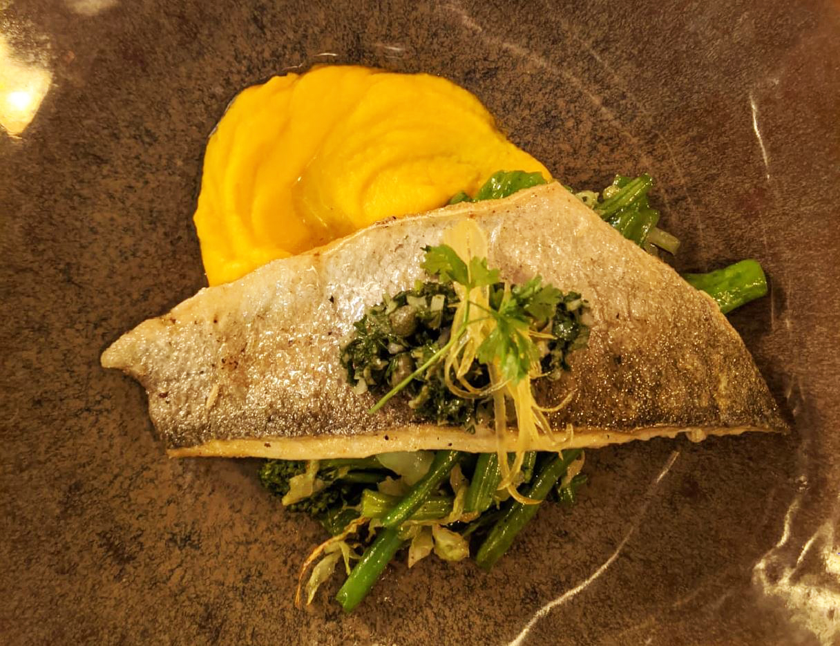 The pan-seared fillet of sea bass makes for a fine main course, with a nicely-crisped skin, resting on a bed of tenderstem broccoli and fine beans, next to a smooth blob of squash mash. The lemon and caper dressing is a little out of sync, with an abundance of capers overpowering the other elements.