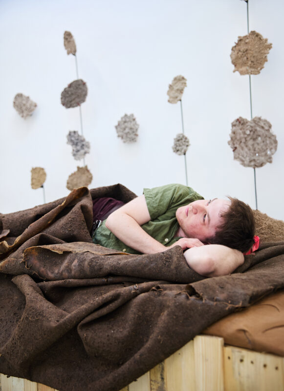 The artist draws on his experience of transness, queerness and disability, particularly with a focus on the periods he has spent waiting: waiting for acceptance, recognition or even medical access. He presents spaces to rest in as forms of care and eventually transformation: the piece My Breath Smells Earthly Strong offers visitors the chance to lie down and cover themselves with a blanket made from latex and soil, that feels not unlike a cocoon.