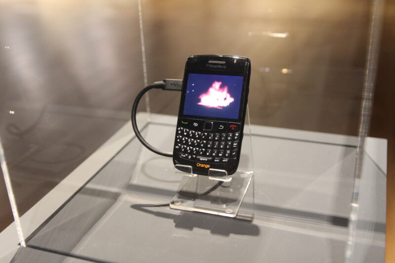 Perretta himself remembers the UK riots of 2011, when BBM (BlackBerry Messenger), became a key tool in communicating and organising for rioters, thanks to its end-to-end encryption. Here, he artist uses the BlackBerry as a symbol of the time and, more literally, a device displaying images of burning furniture at Reeves Corner in Croydon, now a symbolic location where, in the summer of 2011, a family-run shop – the House of Reeves, was burned down.