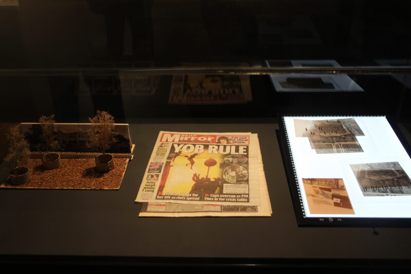 The three-dimensional part of the installation which consists of a painted backdrop and props replicates Reeves Corner – a highly-contested area of now privately owned wasteland, loaded with the memory of recent history. It represents both the anger of the community and the seemingly impossible wish for long-term socioeconomic change that continues to trigger similar events. Reeves Corner is the motif that connects the different elements of the display, combining to tell the story of urban spaces and the ways in which they are shaped by widespread inequality and eventual dissent.