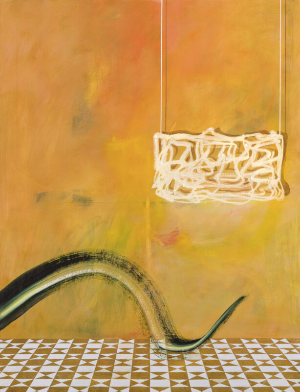 Fallon’s painting If You Were Certain, What Would You Do Then? (2025) is difficult to describe – it appears to depict a semi-abstract interior in warm shades, with a patterned floor but its painterly language is fluid enough that it could be treated as a visual experiment, an attempt to push the boundaries of painting. Judge Louise Giovanelli described it as “a tightrope walk of a painting and there’s nothing quite like it in the show.”