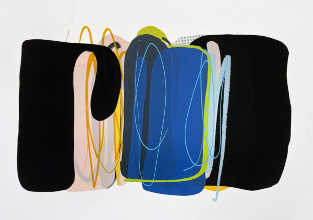 The artist describes using the technique of screen printing as a method of organising the build-up of marks: “The process of screen printing allows me to control gestures made through drawing and then slowly organise my visual language into a more formal structure. Screen printing also allows me to build my images, in a way it is just like collage.