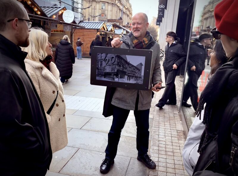 Ric’s debut route rewinds the clock to the 15th and 16th centuries. The Medieval Quarter Tour retraces Manchester’s oldest streets, taking in the timber-framed Shambles buildings, Chetham’s sandstone cloisters and the intricate woodwork within Manchester Cathedral – plus the ominous-sounding Hanging Bridge, one of the oldest surviving structures in the city. Along the way, archival maps and photographs peel back layers of change, revealing how centuries of rebuilding – from post-war repairs to reconstruction following the 1996 IRA bomb – have reshaped the city’s heart.