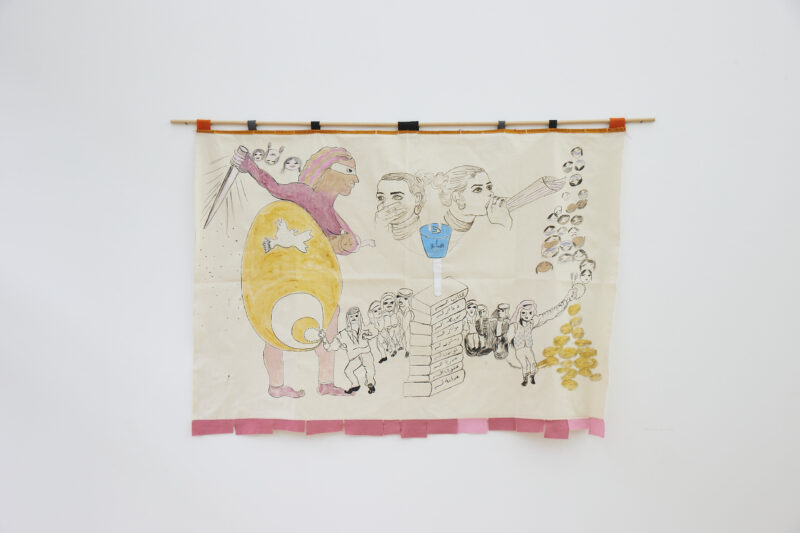 Textile work, paintings, works on paper and films are gathered in the show to tell stories of displacement and uncertainty: Al Solh’s oeuvre focuses on the continued impact of war on people in the Middle East, particularly on the struggles of women, as well as linguistic identity and the significance of oral history as a living record of their experiences.
