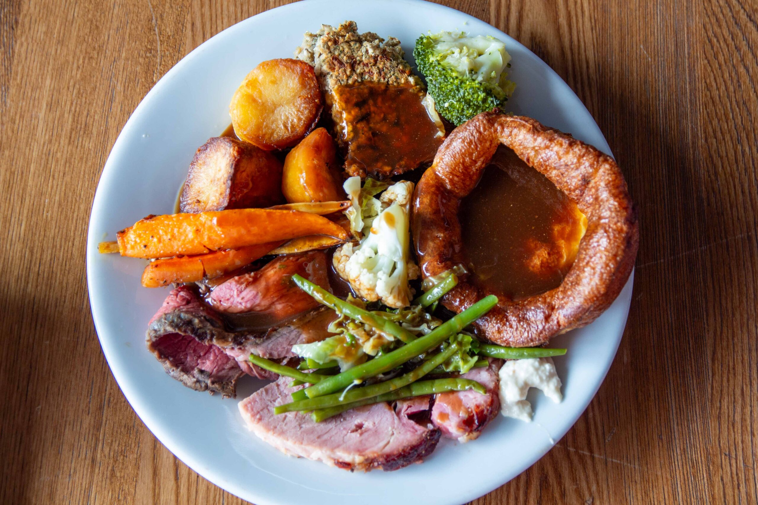It’s not a Sunday roast without a monstrous Yorkshire pudding resting on top, and this is a fine example of the genre. It’s as big as they come, crispy around the edges, soft and lightly gooey in the centre, like every great Yorkshire pud.