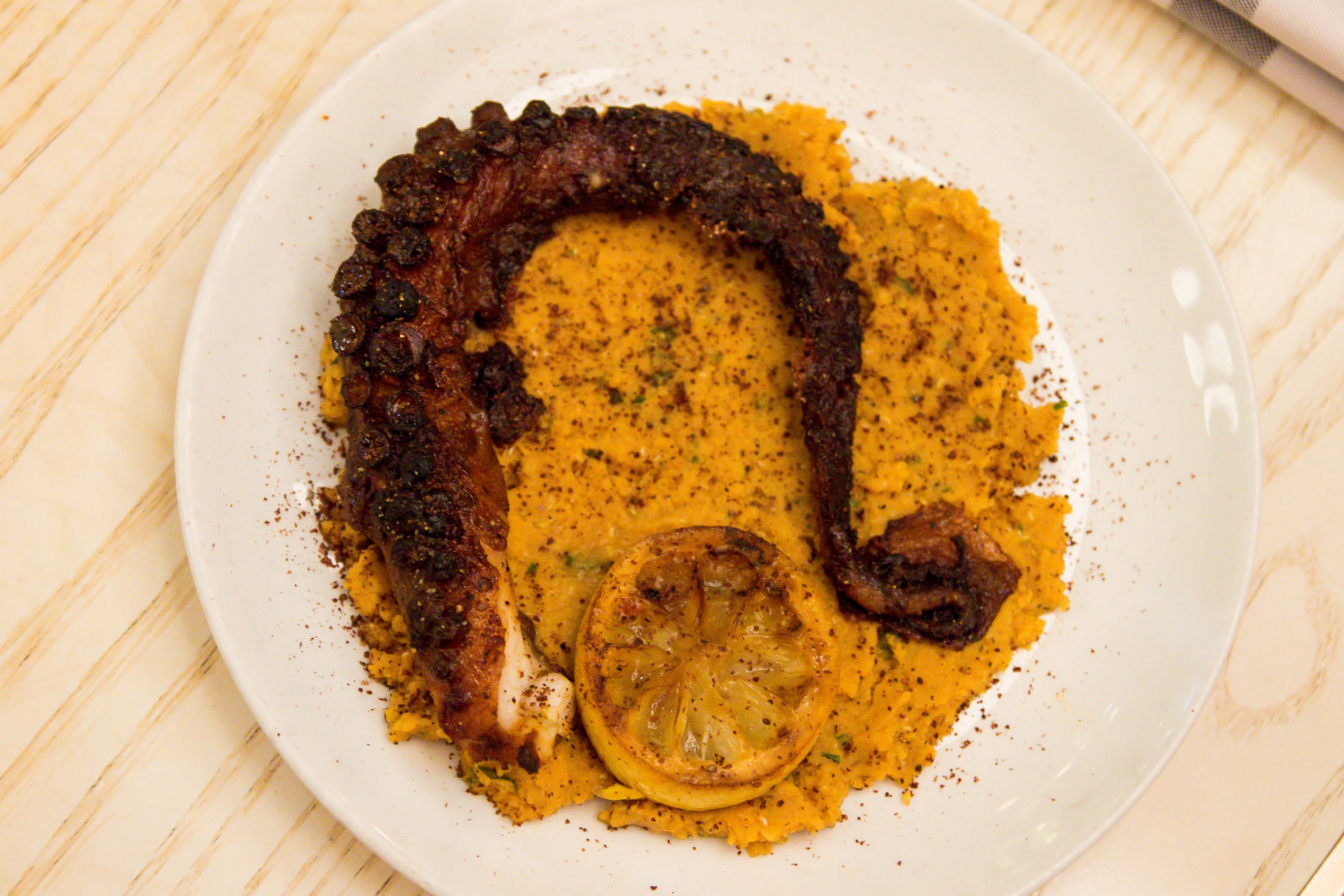 Failing that, the braised octopus is equally delicious, if not more so. It’s remarkable to look at: a long, sucker-studded whip of meaty seafood, darkly charred on the surface, tender and fleshy beneath. A grilled lemon half and a flattened base of gently seasoned hummus finish things off, offering up a complex combination of textures and comforting flavours.