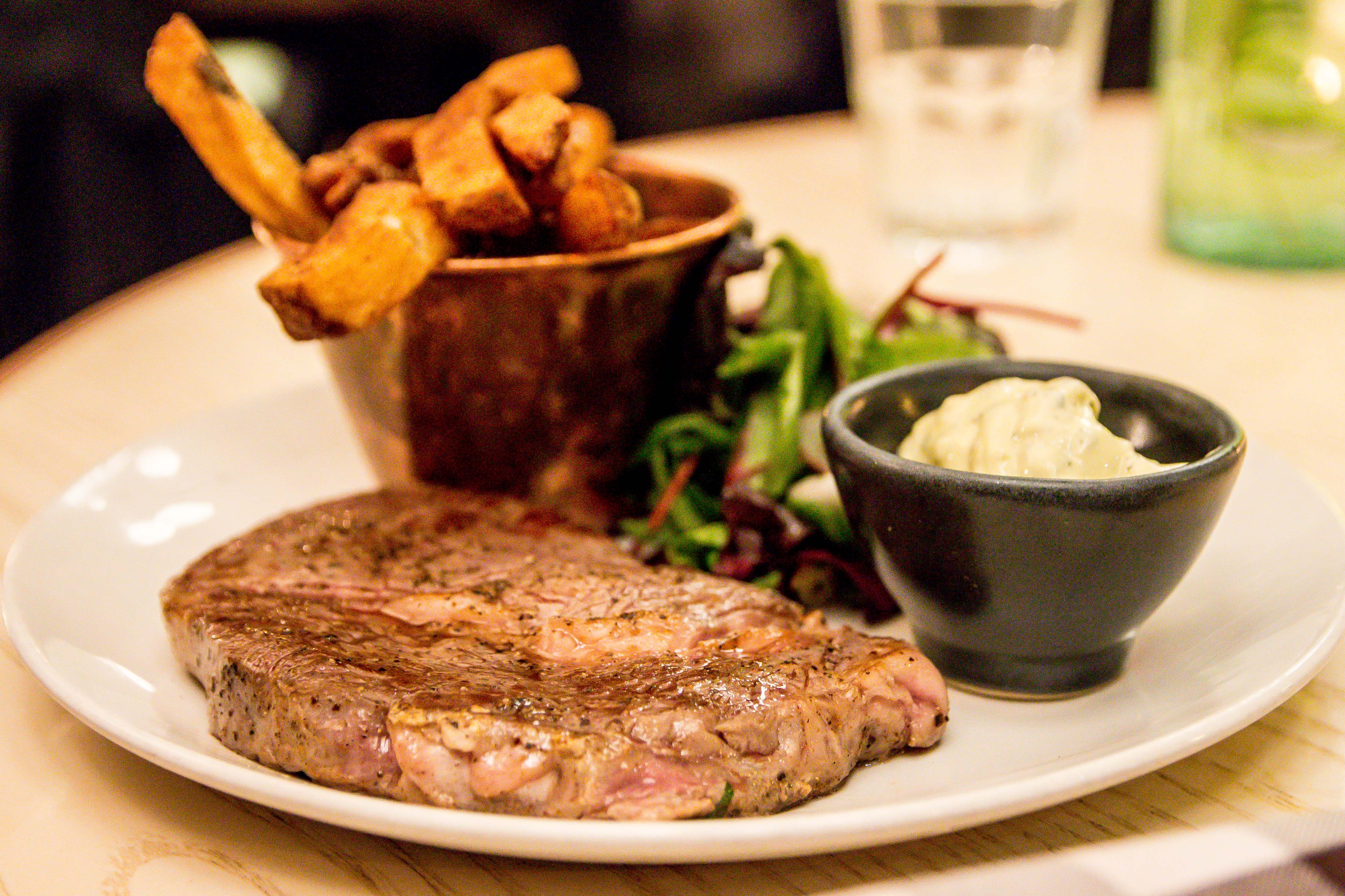 For the large plates, the 25-day dry aged ribeye steak is a fine slab of meat, ordered rare and perfectly pink in the middle, but a hint more darkness on the surface would have lifted it to new heights. The chips are a delight. None of those piddly French fries here, these are handcut chips like your mum used to make, wilting gently but thick and fluffy inside, with a wonderfully salty coating. If you’re a chip connoisseur, you’ll know the type.
