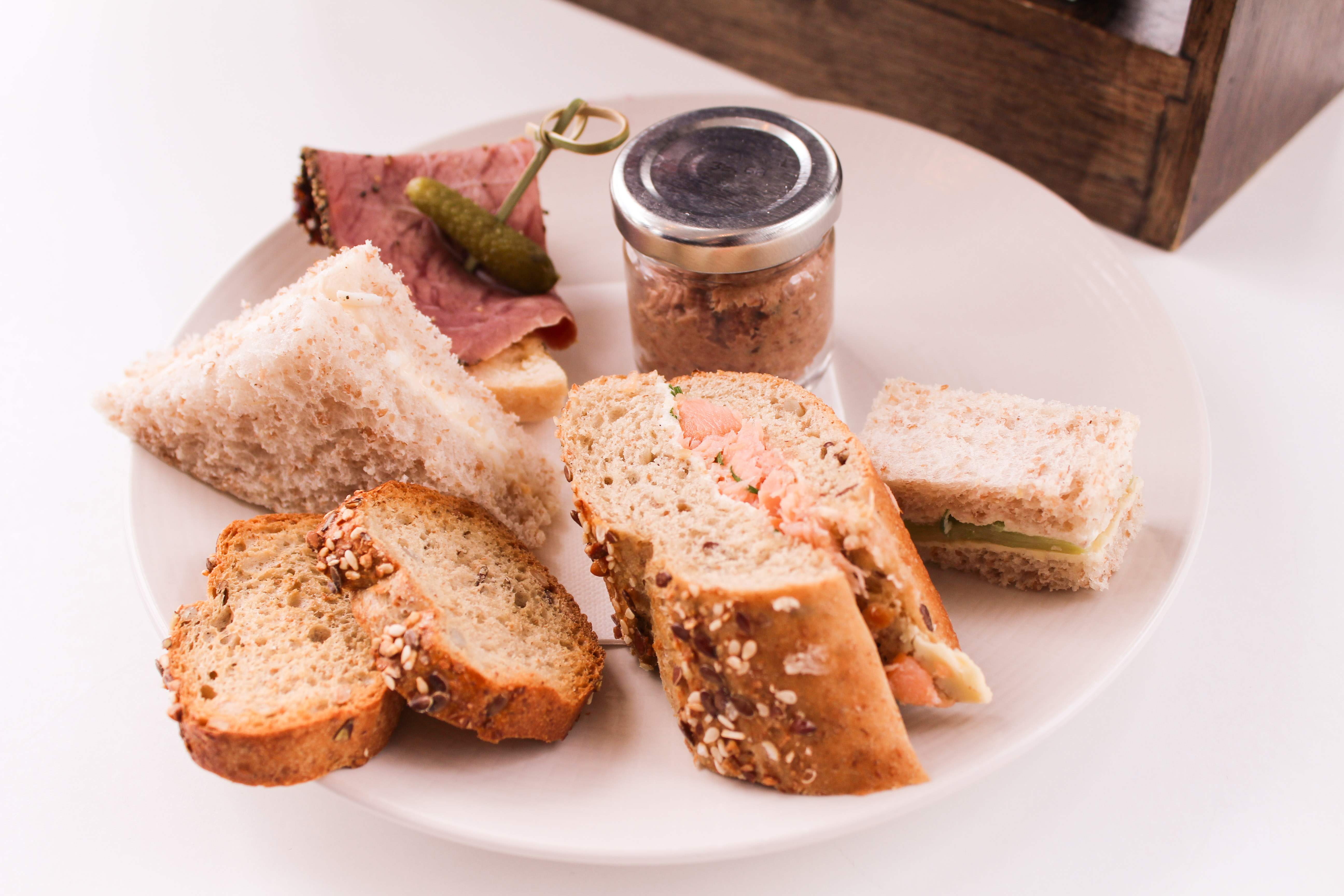 The smoked salmon sandwich offers more substance, thick chunks of seeded bread packed with lightly-heated strips of smoked salmon. These, along with chicken liver paté – presented in a cute glass jar alongside small circles of toasted brown bread – are the most memorable selections, but as good as they are, when it comes to presentation they can’t compete with the miniature cakes.