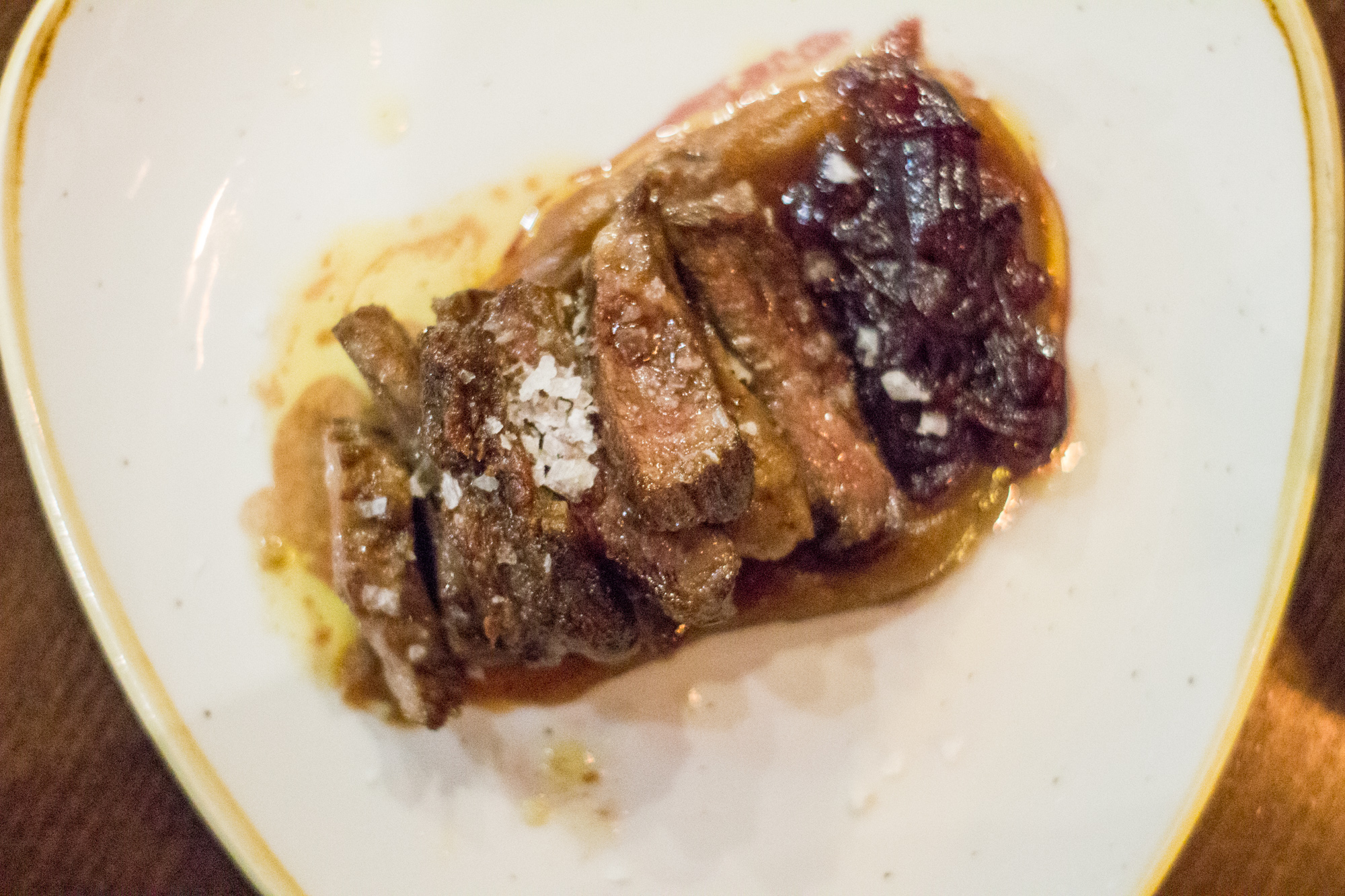 The former is a muscle from the shoulder of the Iberico pig, also known as ‘secreto’ – the butcher’s secret. It’s fantastic, soft, salty and with a hint of sweetness from the pigs’ acorn diet, served with a beer and shallot purée and Lunya’s homemade red onion marmalade.