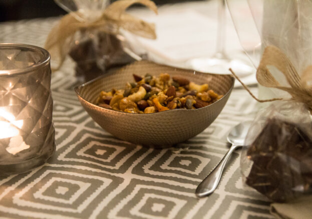 Guests are met with a drink, a potent but delicious orange and cardamom martini for the alcohol-drinkers. Small plates are dotted about the table, consisting of toasted spiced nuts – which are incredibly moreish, olives, traditional hummus, a wonderfully warming carrot, orange and walnut dip and some excellent homemade pitta bread. These are just the opening act though, and as good as they are, we’re all excited to sample the ‘bigger meze’.