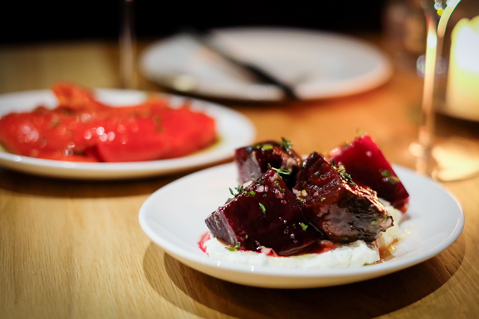 The restaurant is a thoughtful reflection of the food. Nothing bright, themed, or gimmicky but playful work with light and dark, and shape and texture. And lots and lots of open-flame candles.