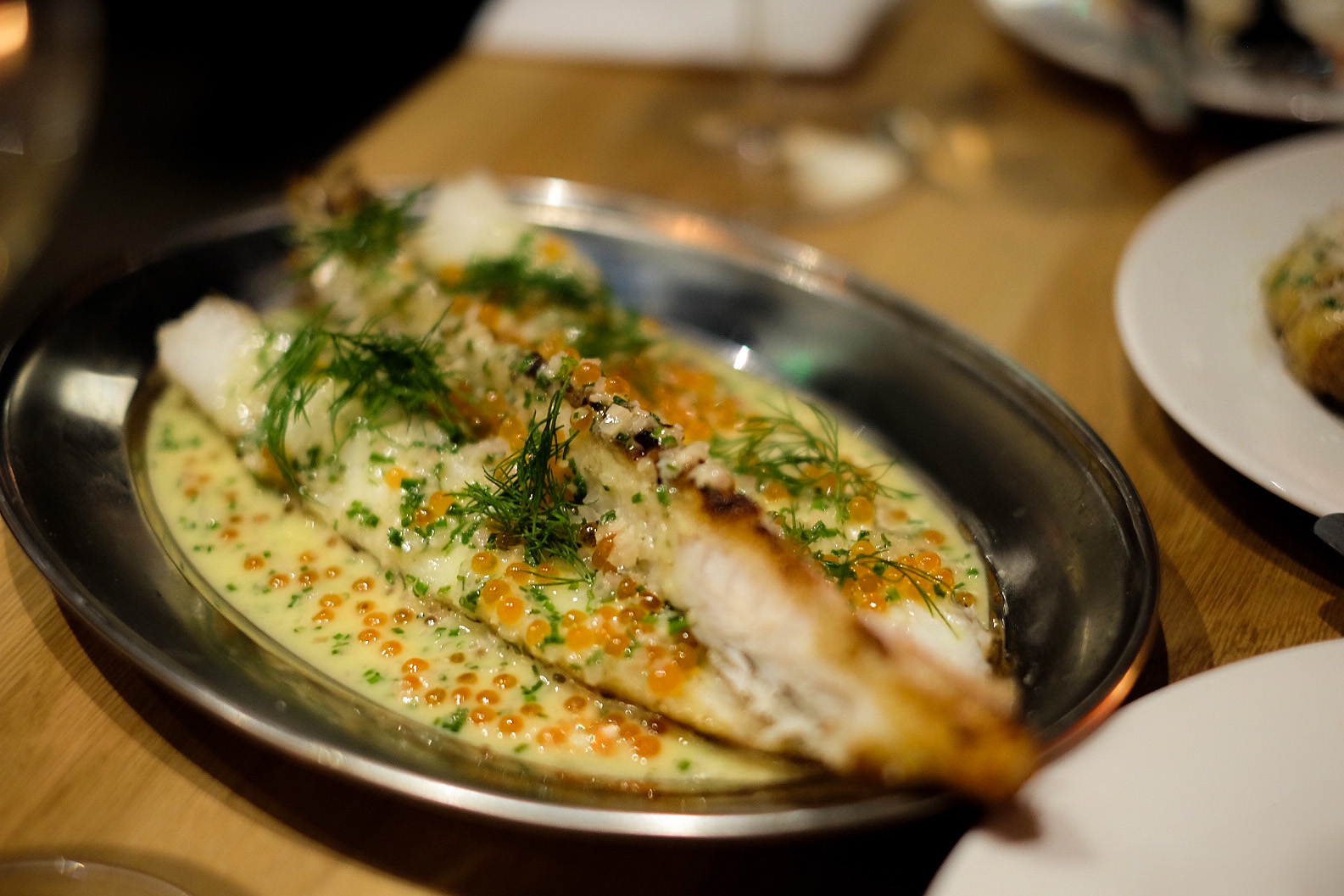 The menu is all small plates, divvied up by categories. From Proteins, the whole monkfish tail is a proper hearty portion and doesn’t stay on the table long. This is distractingly good meaty seafood with a deeply satisfying texture, blitzed with trout roe, beurre blanc and dill. I wasn’t brave enough to lick the plate, but I came embarrassingly close.