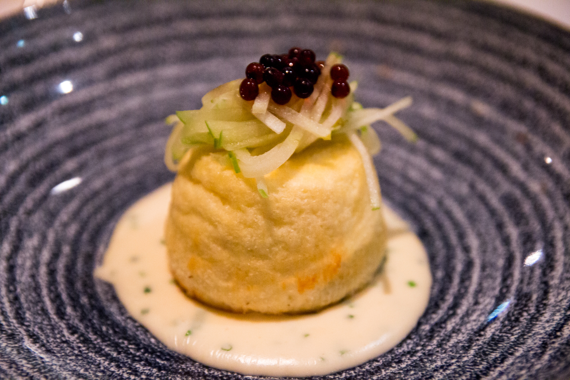 Even better is the twice-baked cheese soufflé, made with creamy, full-flavoured Lancashire Bomb cheese. It’s beautifully fluffy and light, with a punch-packing hit from the tangy locally-sourced cheese. The thin strips of apple and tiny balsamic pearls aren’t just for decoration either – each element lifts the soufflé to new, ever-more satisfying, heights.