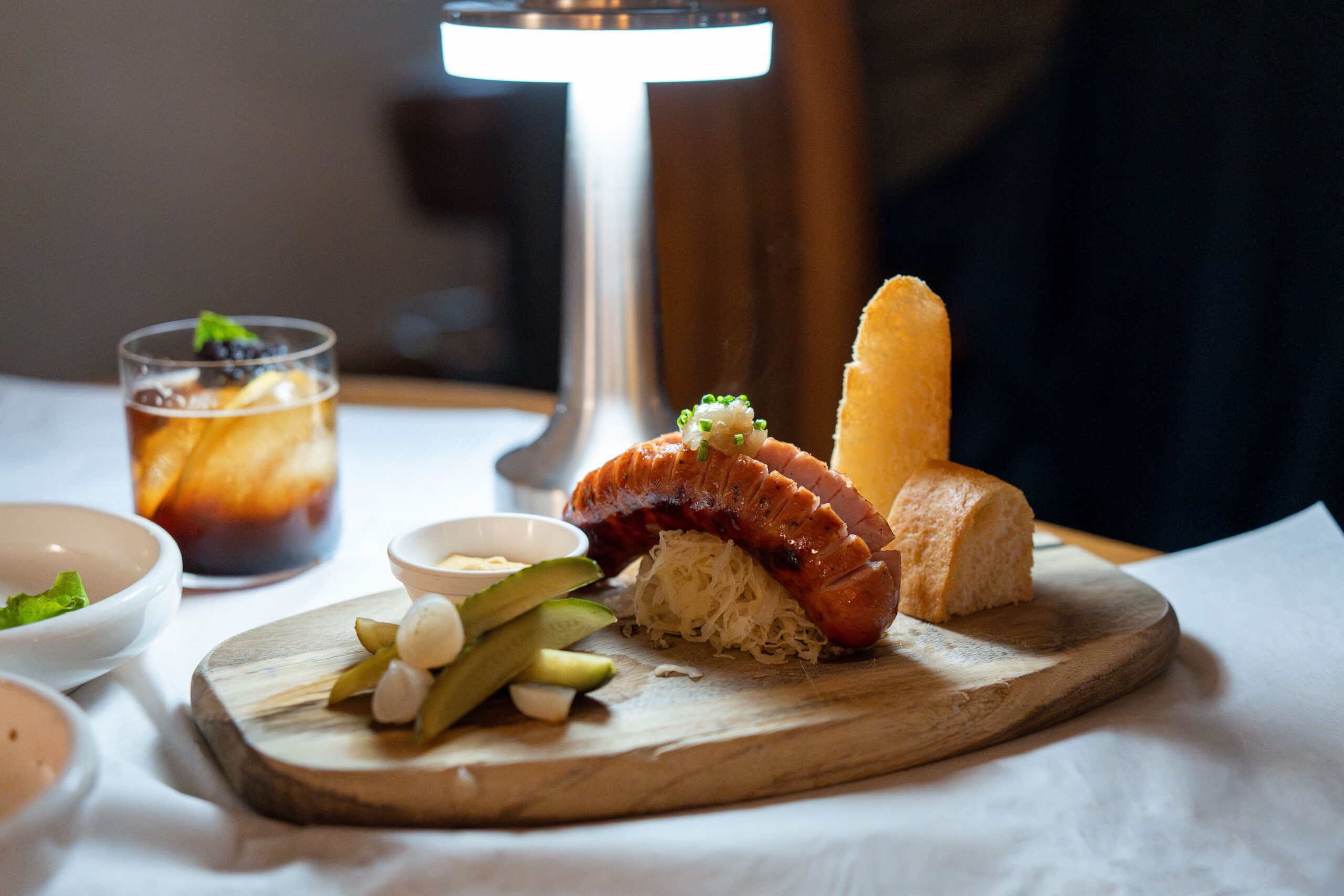 The smoked sausage is presented artfully on a wooden plinth. Almost too artfully, in fact. Under this light, it looks like something from a Caravaggio painting, albeit Caravaggio in his epicurean years.