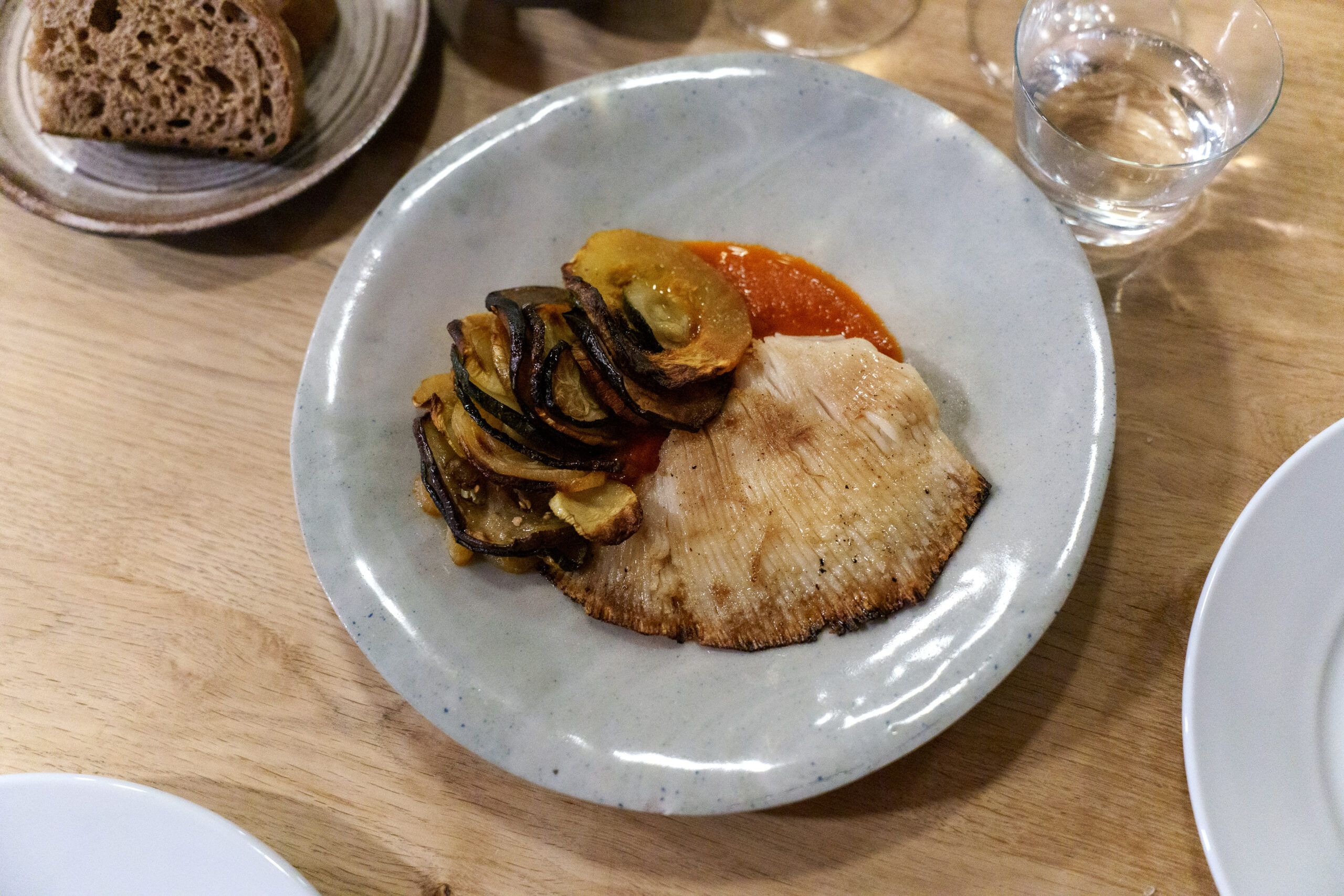 The fish course is a textural marvel. Soft buttery skate wing flesh is set off by a careful charring at the edges – vorsprung durch fisch engineering – with a bright, almost sweet, ratatouille-adjacent confit byaldi on the side.
